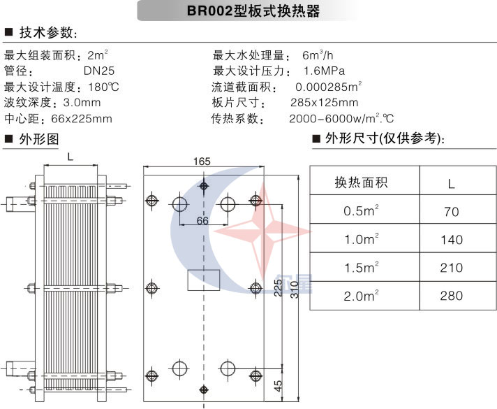 | 板片材質: 不銹鋼材質:SUS304、321、316、316L、純鈦TAI-A 密封墊片: 丁晴膠(NBR) (使用溫度:-20-+120℃)三元乙丙膠(EPDM) (使用溫度:-50-+150℃)氟膠(Viton) (使用溫度:-0-+180℃) 板片厚度: 0.5mm |
