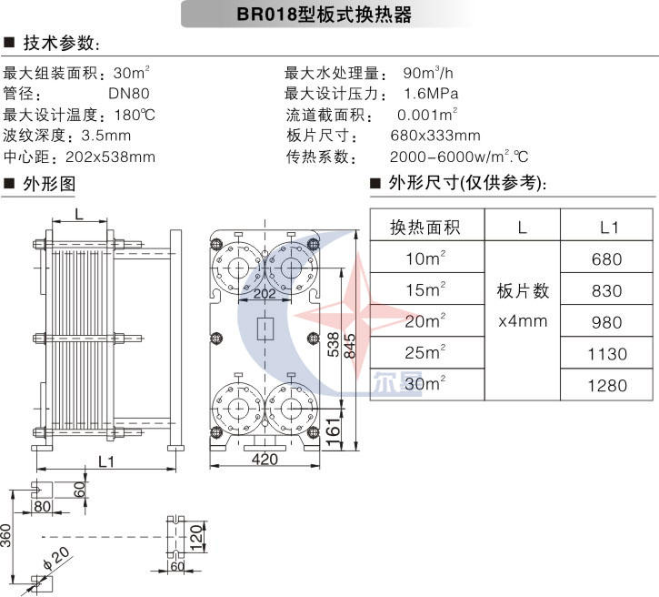 BR018型板式換熱器是一種新型的節能熱交換裝置,具有傳熱效果高、結構緊湊、占地面積小、 操作簡便,清洗、拆卸、維護方便,容易改變換熱面積或流程組合等優點。 板片人字形波紋,介質流動形成湍流狀態,粘膠式密封墊片。傳熱系數能高達2000~6000 W/m2.℃ 左右。 本產品適用于化工、機械、食品、飲料、醫藥、住宅供暖、供熱水、空調等部門。 |