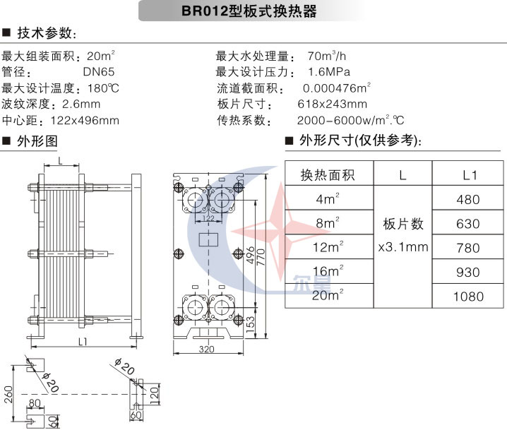 BR012型板式換熱器 是一種新型的節能熱交換裝置,具有傳熱效果高、結構緊湊、占地面積小、 操作簡便,清洗、拆卸、維護方便,容易改變換熱面積或流程組合等優點。 板片人字形波紋,介質流動形成湍流狀態,粘膠式密封墊片。傳熱系...